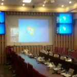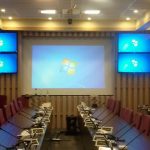 تعداد 5 نمایشگر در انتهای سالن نصب شده که قابلیت انتقال تصاویر سالن مانیتورینگ را به سالن کنفرانس دارا هستند. پرده نمایش اصلی که با یک دیتا پروژکتور 4000 انسی لومن نمایش داده می شود می تواند یکی از تصاویر دلخواه باشد و یا Presentation.